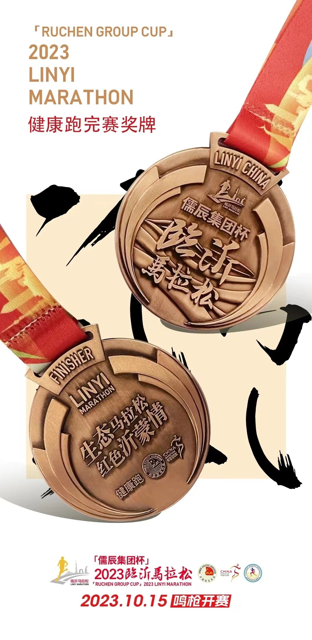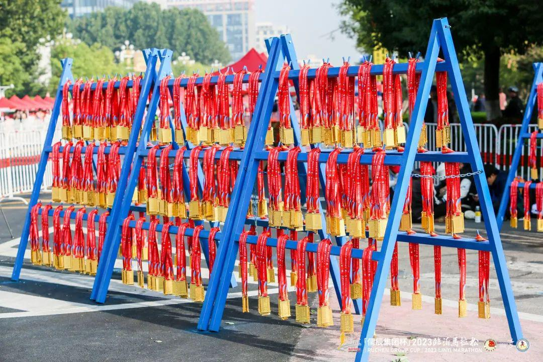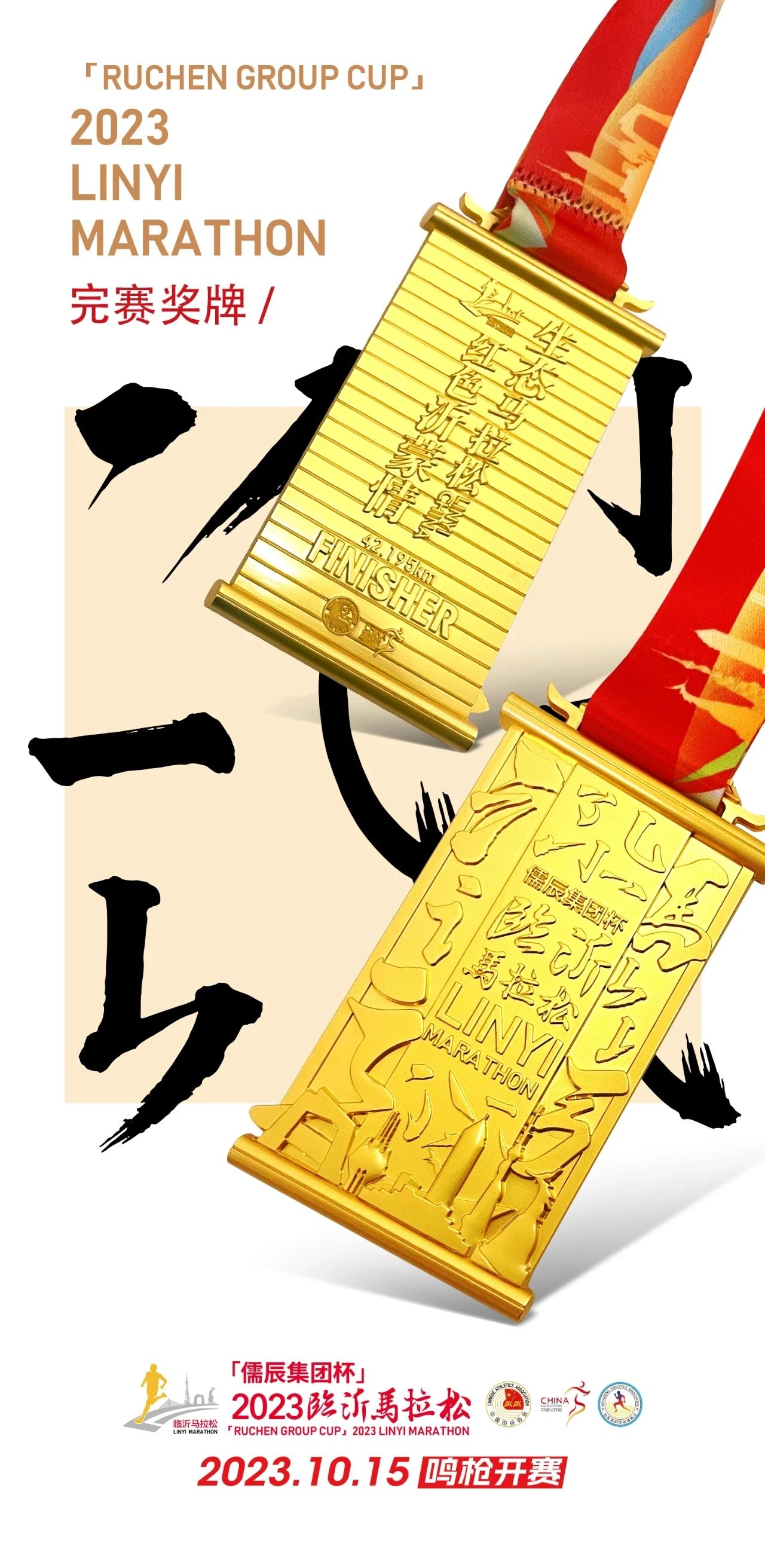 本届赛事的全、半程马拉松奖牌整体以卷轴为造型,正面以书圣王羲之笔迹镌刻有中华汉字多个偏旁部首,正中则印有赛事全称,奖牌底部融入临沂地标性建筑,将这座城市独一无二的风貌予以集合呈现,以一场赛事带跑者感受临沂深厚的历史底蕴和文化沉淀。奖牌背面则竹简为造型,印有临马口号“生态马拉松,红色沂蒙情”字样,将临沂城市特质予以总结概况,极具纪念价值。红色绶带印有与奖牌相同的临沂地标性建筑。全程与半程跑者奖牌样式相同,于奖牌背面标注相应公里数加以区分。